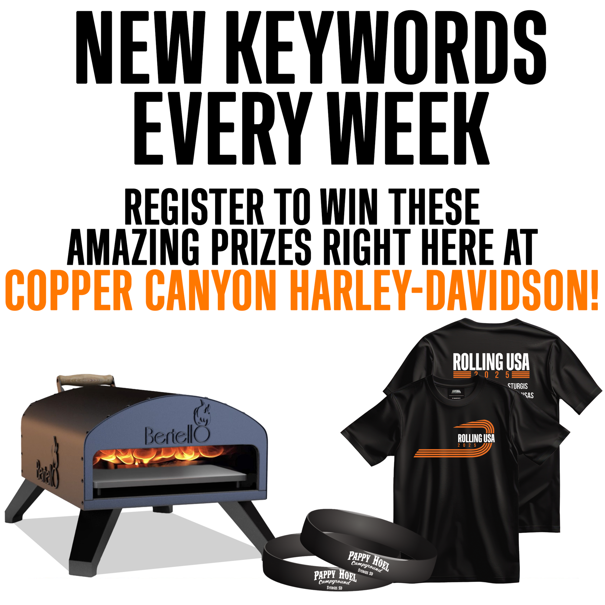 Want to increase your odds of winning? Stop by Copper Canyon Harley-Davidson everyday for a NEW KEYWORDS EVERY WEEK! Each keyword grants you the ability to get another entry into the sweepstakes and contests happening at the dealership. Want even MORE keywords? Ask us how!