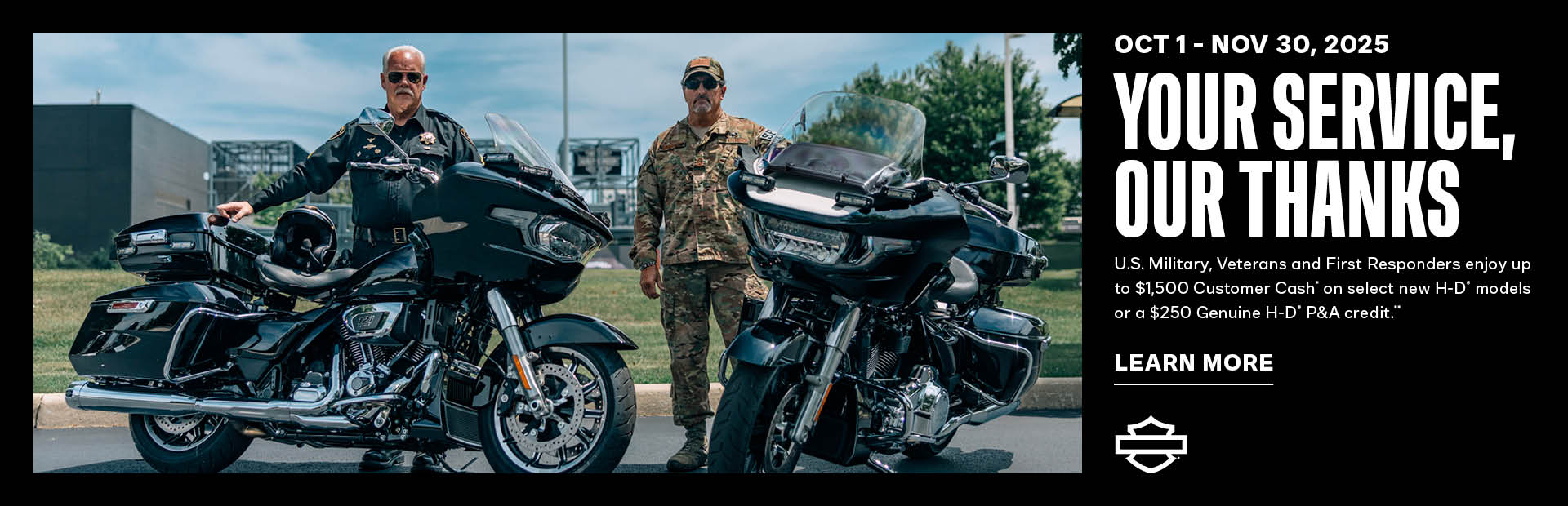 $1,000 incentive valid towards the purchase price of select new, untitled Street Glide and Road Glide motorcycles, $1,500 incentive valid towards the purchase price of select new, untitled Street Glide Ultra motorcycles, or $750 incentive valid towards the purchase price of select new, untitled Pan America 1250 Special motorcycles, all available and in stock at participating H-D dealers in the continental U.S. including Hawaii and Alaska. At participating dealers only. Eligible customers must visit H-D.com/Military or H-D.com/firstrespondersoffer and validate through the ID.me button to receive H-D Hero code. This promotional offer is valid for the named party only and is non-transferable. Offer valid on purchases made on and between October 1, 2025 to November 30, 2025. Offer cannot be used towards the down payment on a motorcycle. Limit one offer per eligible customer and per eligible motorcycle purchase per year. Offer not valid on previous purchases or future motorcycle orders after November 30, 2025. This Offer may not be combined with the $250 Harley-Davidson Genuine Parts and Accessories incentive, but may be combined with certain specific, in-market H-D promotions, but some restrictions apply. Please see your authorized Harley-Davidson dealership to determine what offers, discounts or promotions, such as Harley-Davidson finance offers, can be combined with this Offer. The unique ID.me H-D Hero Offer code must be presented at time of purchase to be eligible. Harley-Davidson and/or dealer are not responsible for lost or stolen offers. Offer is subject to change at any time without notice. Void where prohibited or restricted by law. Cannot be redeemed for cash or cash equivalent and is non-refundable.