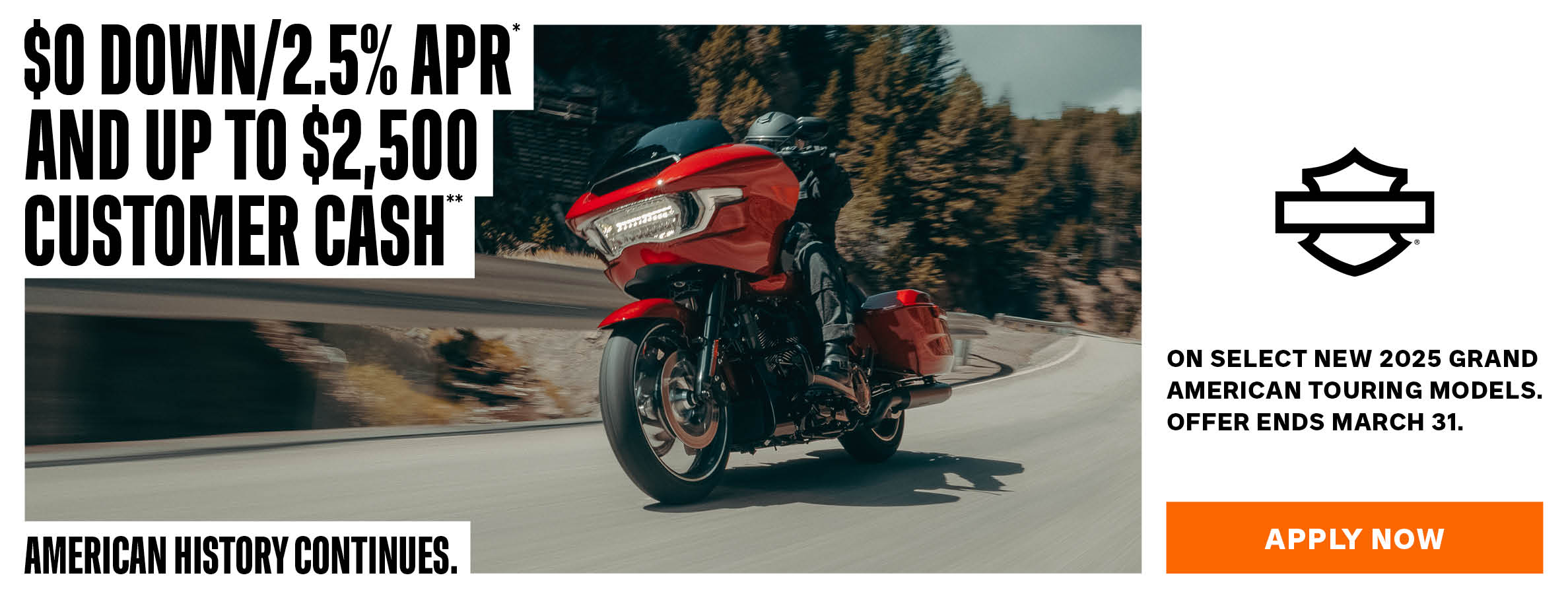 through Eaglemark Savings Bank and is subject to credit approval. Harley-Davidson® CVO™ motorcycles are excluded. Not all applicants will qualify as the Annual Percentage Rate (APR) will vary based on the applicant’s past credit performance and the term of the loan. Financing offer is available only for up to a 36-month term. For example, a 2025 Road Glide motorcycle in Brilliant Red with Black trim and an MSRP of $30,199, no down payment and amount financed of $30,199, 36-month repayment term, and 2.50% APR results in monthly payments of $871.58. In this example, customer is responsible for applicable taxes, title, licensing fees and any other fees or charges at the time of sale. APR is calculated according to the simple interest method. Not valid in conjunction with other offers. Customer must take delivery by March 31, 2026. This Financing Offer is valid during the period of January 1, 2026 to March 31, 2026. Other terms, conditions, and limitations may apply. Dealer participation may vary.