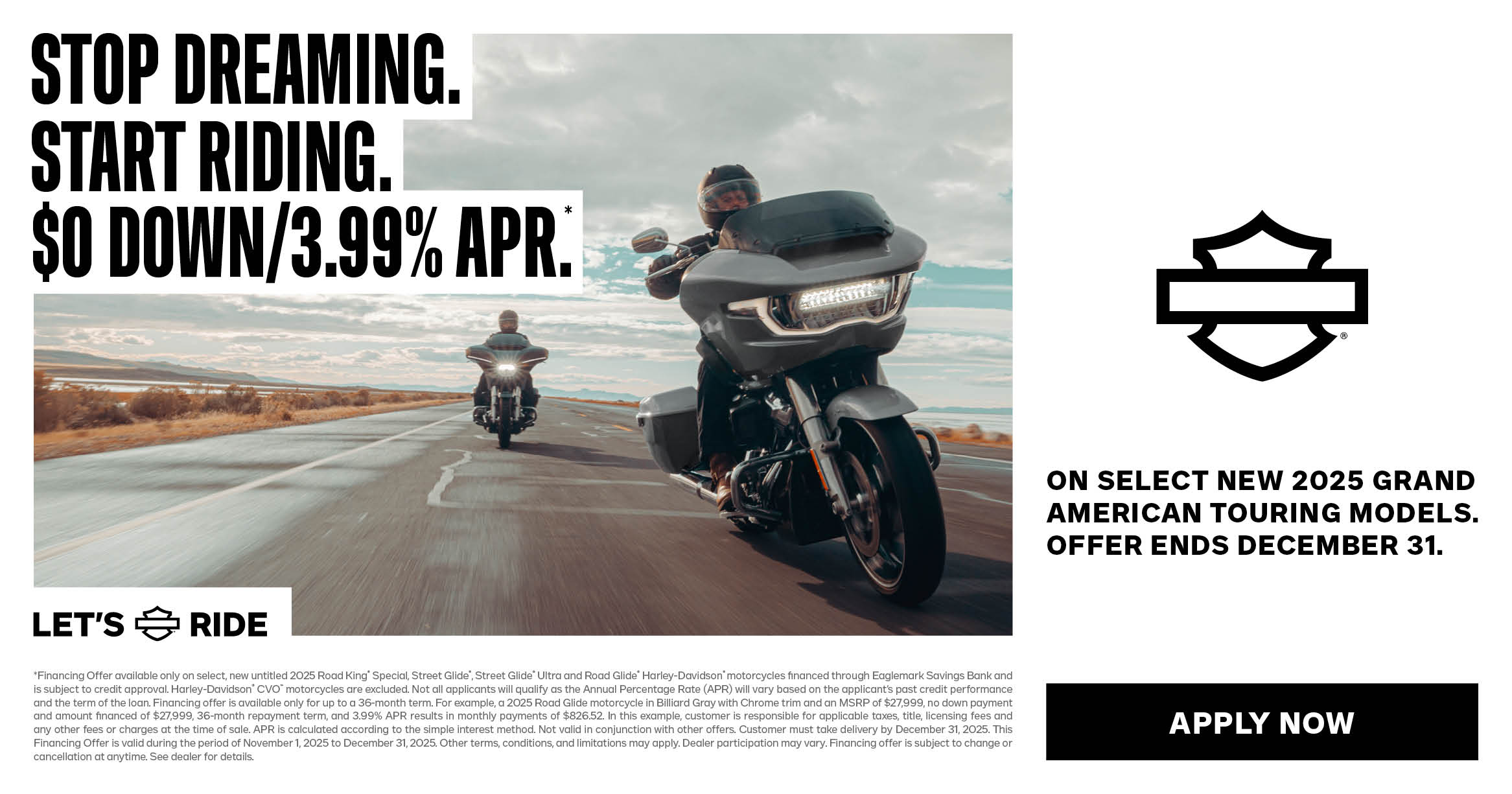 *Financing Offer available only on select, new untitled 2025 Road King® Special, Street Glide®,Street Glide® Ultra and Road Glide® Harley-Davidson® motorcycles financed through Eaglemark Savings Bank and is subject to credit approval. Harley-Davidson® CVO™ motorcycles are excluded. Not all applicants will qualify as the Annual Percentage Rate (APR) will vary based on the applicant’s past credit performance and the term of the loan. Financing offer is available only for up to a 36-month term. For example, a 2025 Road Glide motorcycle in Billiard Gray with Chrome trim and an MSRP of $27,999, no down payment and amount financed of $27,999, 36- month repayment term, and 3.99% APR results in monthly payments of $826.52. In this example, customer is responsible for applicable taxes, title, licensing fees and any other fees or charges at the time of sale. APR is calculated according to the simple interest method. Not valid in conjunction with other offers. Customer must take delivery by December 31, 2025. This Financing Offer is valid during the period of November 1, 2025 to December 31, 2025. Other terms, conditions, and limitations may apply. Dealer participation may vary. Financing offer issubject to change or cancellation at anytime. See dealer for details.